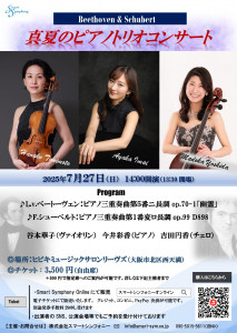 シューベルトのピアノ三重奏曲第1番は晩年の屈指の傑作であり同年に書かれた歌曲集「冬の旅」とは全く違う快活で堂々とした音楽、そしてシューベルトならでは歌心にあふれた美しい旋律に包まれる音楽をピアノ、ヴァイオリン、チェロが素敵に力強くお互い主張しながら奏でて聴きどころ満載の作品です。もう一つのプログラムはシューベルトのトリオが書かれた前年にこの世を去ったベートーベンのピアノ三重奏曲第5番「幽霊」、こちらも素晴らしい作品です。演奏はヴァイオリン谷本華子さん、チェロ吉田円香さん、ピアノ今井彩香さんにコンサートマスターとしてソリストとしてあるいは室内楽メンバーとして大活躍の3人がサロンリーヴズに会します。